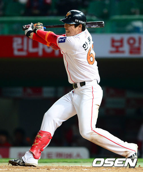 19일 오후 인천 문학구장에서 열린 '2013 한국야쿠르트 세븐 프로야구' SK 와이번스와 KIA 타이거즈의 경기 7회말 2사 1,3루 한동민이 1타점 적시타를 치고 있다.