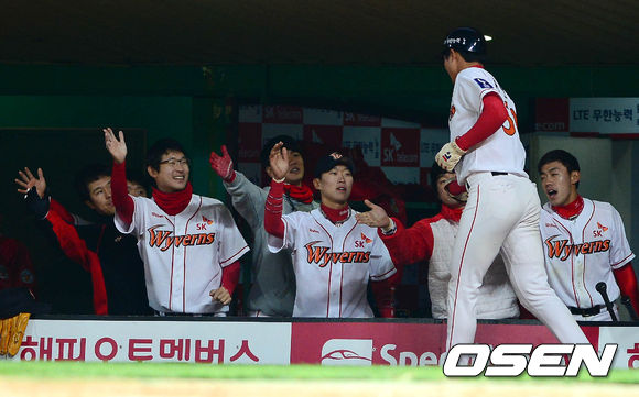 19일 오후 인천 문학구장에서 열린 '2013 한국야쿠르트 세븐 프로야구' SK 와이번스와 KIA 타이거즈의 경기 7회말 2사 1,3루 한동민의 1타점 적시타에 홈을 밟은 3루주자 정진기가 덕아웃에서 동료들과 하이파이브를 하고 있다.