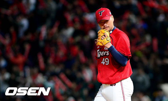19일 오후 인천 문학구장에서 열린 '2013 한국야쿠르트 세븐 프로야구' SK 와이번스와 KIA 타이거즈의 경기 7회말 2사 1,3루 한동민에게 1타점 적시타를 내준 김진우가 고개를 떨구고 있다.