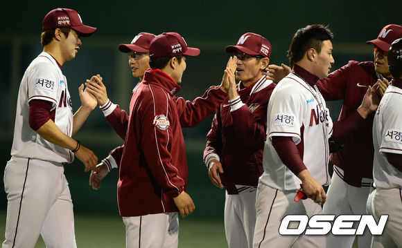 경기후 승리투수 박성훈, 7이닝 무실점 선발 김병현, 끝내기 솔로포 박병호가 염경엽 감독을 비롯한 코칭스태프와 하이파이브를 하고 있다 /jpnews@osen.co.kr