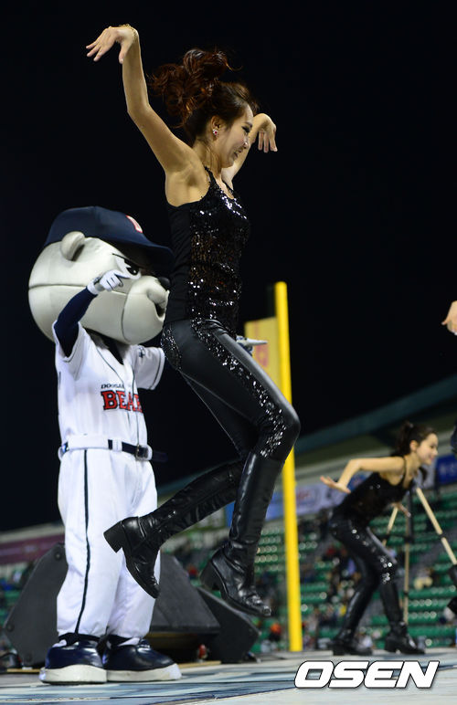19일 오후 서울 잠실야구장에서 '2013 한국야쿠르트 세븐 프로야구' 두산 베어스 대 한화 이글스의 경기가 열렸다. 두산 치어리더가 멋진 응원을 펼치고 있다.