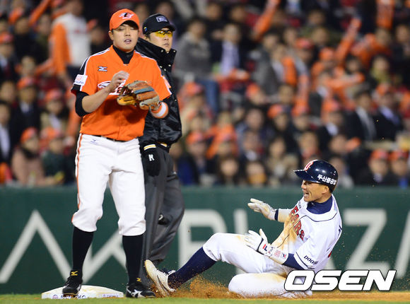 2회말 두산은 허경민이 몸에 맞는 볼로 출루하며 선두타자가 살아나갔다. 그러자 한화는 김경태를 빼고 신예 우완 이태양을 마운드에 올렸다. 그러나 두산은 양의지의 좌전 안타로 무사 1,2루를 만들었다. 찬스를 잡은 민병헌은 이태양의 4구 째를 공략해 우중간에 떨어지는 1타점 2루타로 3-0을 만들었다.