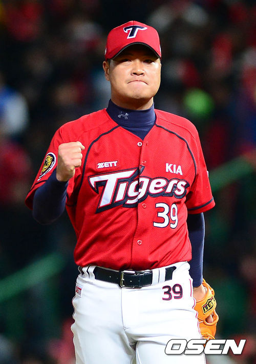 19일 오후 인천 문학구장에서 열린 '2013 한국야쿠르트 세븐 프로야구' SK 와이번스와 KIA 타이거즈의 경기 8회말 2사 2루 김성현을 삼진으로 처리한 유동훈이 기뻐하고 있다.