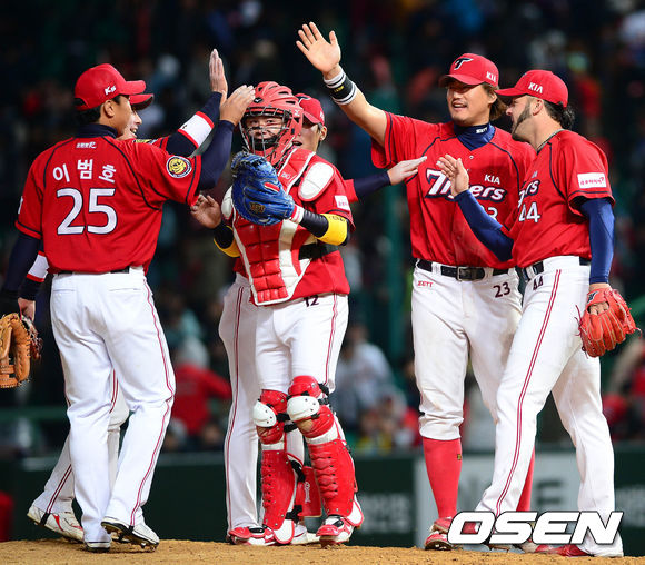 19일 오후 인천 문학구장에서 열린 '2013 한국야쿠르트 세븐 프로야구' SK 와이번스와 KIA 타이거즈의 경기 종료 후 KIA 선수들이 하이파이브를 하고 있다.