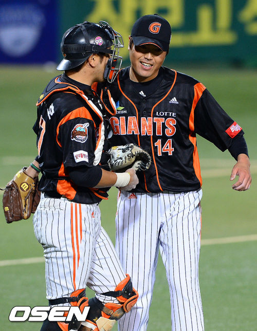 9회말 위기를 막은 롯데 강영식이 강민호와 승리의 기쁨을 나누고 있다./ soul1014@osen.co.kr