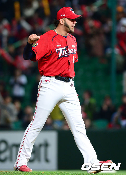 19일 오후 인천 문학구장에서 열린 '2013 한국야쿠르트 세븐 프로야구' SK 와이번스와 KIA 타이거즈의 경기 종료 후 앤서니가 승리를 기뻐하고 있다.