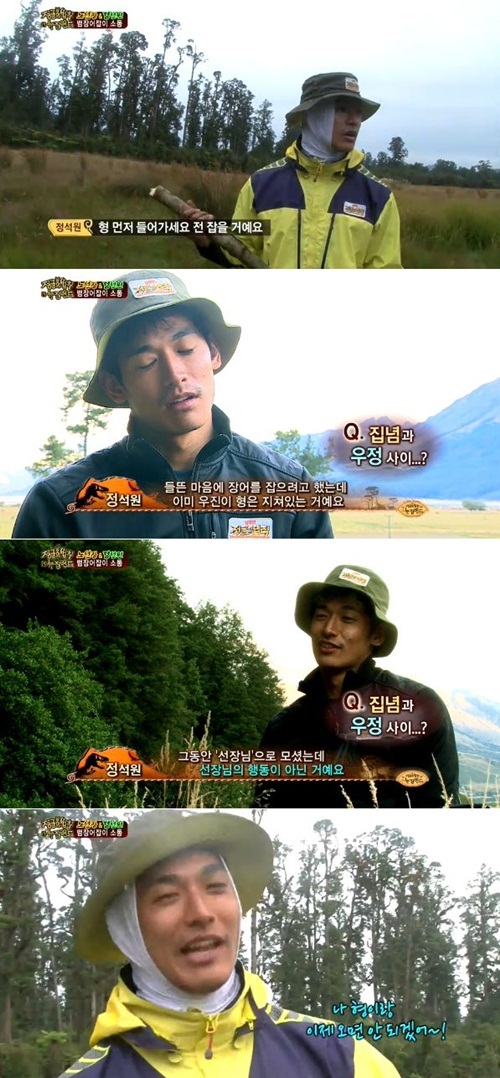 정석원이 식량확보를 위해 뱀장어를 잡으려 시도하는 과정에서 포기하고 돌아가자는 노우진에게 실망하는 모습이 그려졌다. 이 모습과 정석원 인터뷰 등과 함께 가수 백지영의 노래 '그여자'가 BGM으로 삽입됐다. 드라마 '시크릿 가든' OST로 인기를 끌었던 노래.
