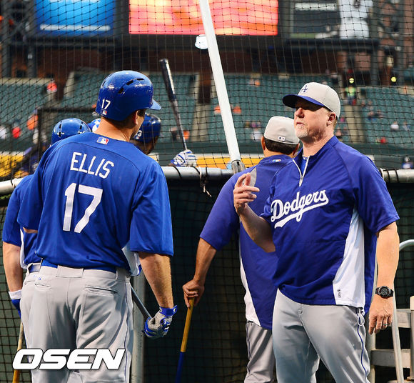 20일 오전(이하 한국시간) 미국 메릴랜드주 볼티모어 오리올 파크에서 ‘2013 메이저리그’ 볼티모어 오리올스와 LA 다저스의 경기가 열릴 예정인 가운데 양팀 훈련시간에 LA 다저스 마크 맥과이어 타격 코치가 A.J 엘리스에게 타격 조언을 하고 있다.