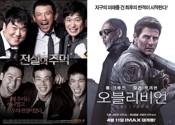 외화 ‘오블리비언’과 한국영화 ‘전설의 주먹’(감독 강우석)이 1위 자리를 놓고 엎치락뒤치락 치열한 경쟁을 펼치고 있다.