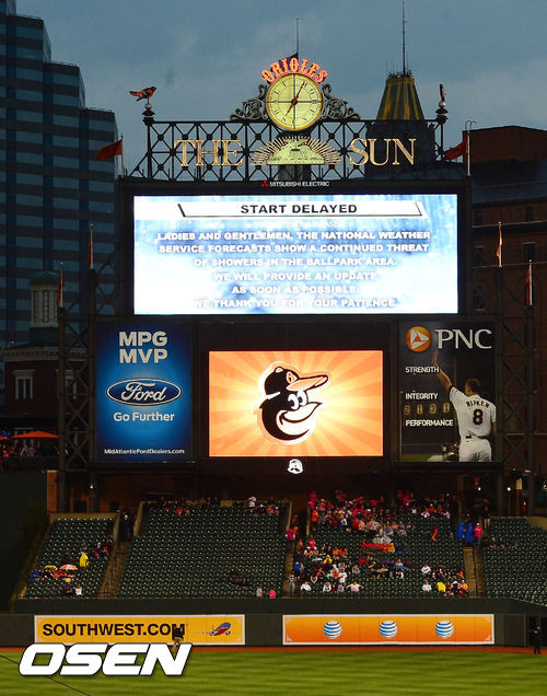 20일 오전(이하 한국시간) 미국 메릴랜드주 볼티모어 오리올 파크에서 ‘2013 메이저리그’ 볼티모어 오리올스와 LA 다저스의 경기가 열릴 예정인 가운데 경기 시작 직전 비가 내려 방수포가 그라운드에 깔리며 경기가 지연되고 있다.