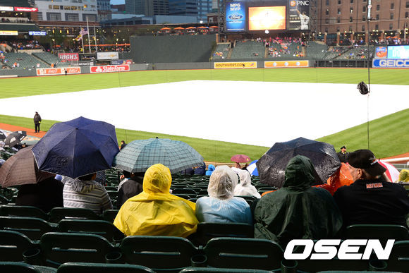 20일 오전(이하 한국시간) 미국 메릴랜드주 볼티모어 오리올 파크에서 ‘2013 메이저리그’ 볼티모어 오리올스와 LA 다저스의 경기가 열릴 예정인 가운데 경기 시작 직전 비가 내려 방수포가 그라운드에 깔리며 경기가 지연되고 있다.