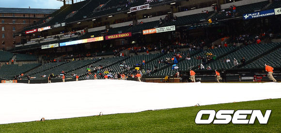 20일 오전(이하 한국시간) 미국 메릴랜드주 볼티모어 오리올 파크에서 ‘2013 메이저리그’ 볼티모어 오리올스와 LA 다저스의 경기가 열릴 예정인 가운데 경기 시작 직전 비가 내려 방수포가 그라운드에 깔리며 경기가 지연되고 있다.