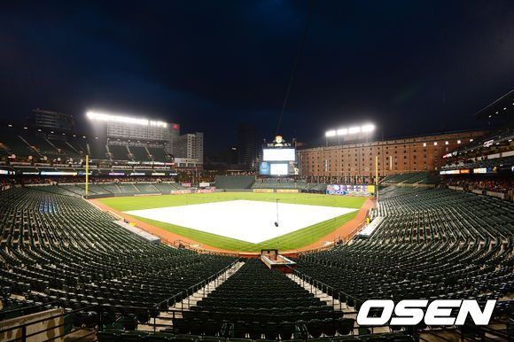 20일 오전(이하 한국시간) 미국 메릴랜드주 볼티모어 오리올 파크에서 ‘2013 메이저리그’ 볼티모어 오리올스와 LA 다저스의 경기가 열릴 예정인 가운데 경기 시작 직전 비가 내려 방수포가 그라운드에 깔리며 경기가 지연되고 있다.