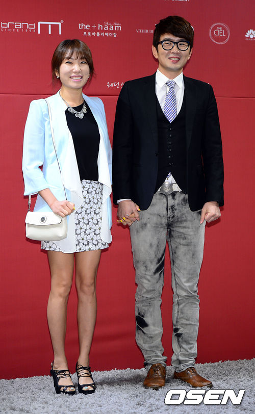 20일 오전 서울 삼성동 컨벤션 디아망에서 열리는 개그맨 김준현 결혼식장을 찾은 윤형빈, 정경미 부부가 포토타임을 갖고 있다.