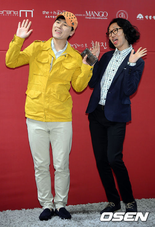 20일 오전 서울 삼성동 컨벤션 디아망에서 열리는 개그맨 김준현 결혼식장을 찾은 변기수, 김경진이 포토타임을 갖고 있다.