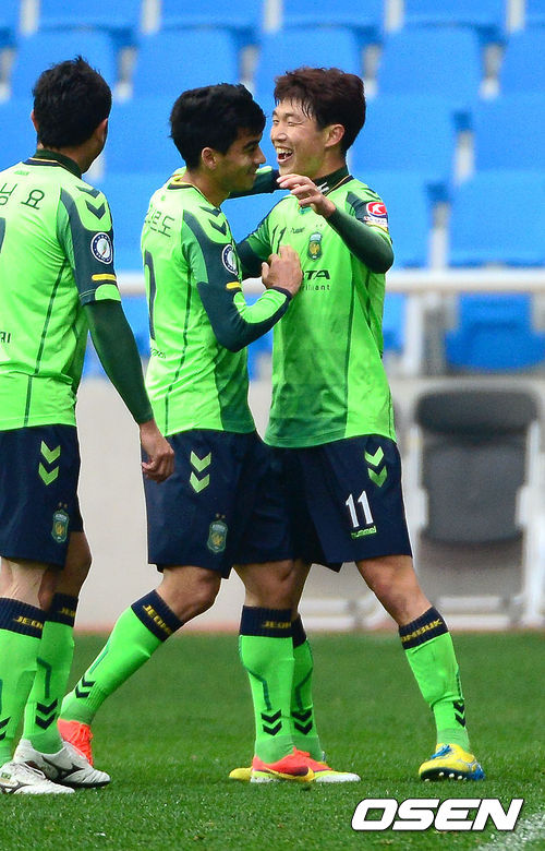 20일 오후 인천축구전용경기장에서 열린 '현대오일뱅크 K리그 클래식 2013' 8라운드 인천 유나이티드와 전북 현대의 경기 전북 이승기가 선제골을 넣고 레오나르도와 포옹을 하고 있다.