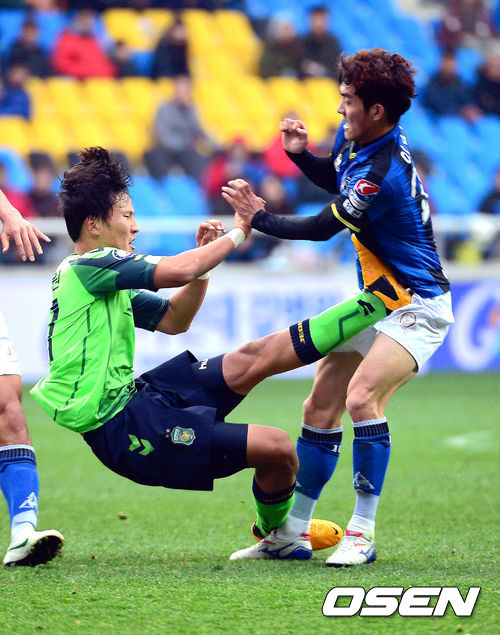 20일 오후 인천축구전용경기장에서 열린 '현대오일뱅크 K리그 클래식 2013' 8라운드 인천 유나이티드와 전북 현대의 경기 전반 인천 이석현이 전북 권경원과 충돌하고 있다.