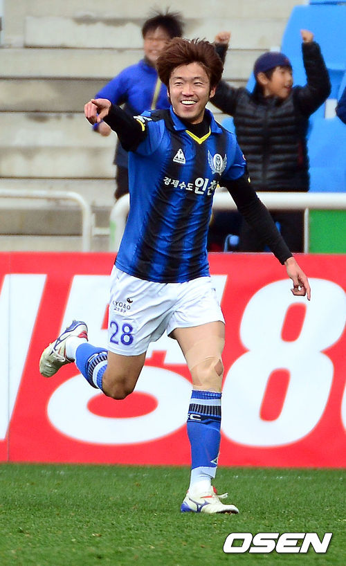 20일 오후 인천축구전용경기장에서 열린 '현대오일뱅크 K리그 클래식 2013' 8라운드 인천 유나이티드와 전북 현대의 경기 후반 인천 이호균이 추가골을 넣고 기뻐하고 있다.