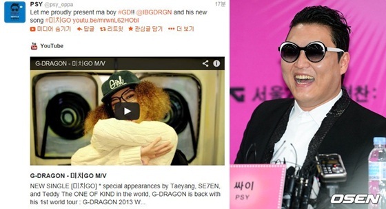 국제가수 싸이가 소속사 후배가수인 지드래곤의 신곡 '미치GO'를 직접 언급하며 응원의 목소리를 보탰다.