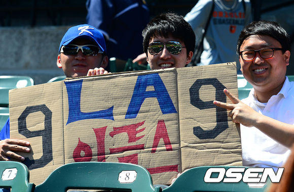 경기 전 류현진 한국인 팬들이 피켓을 들고 있다.