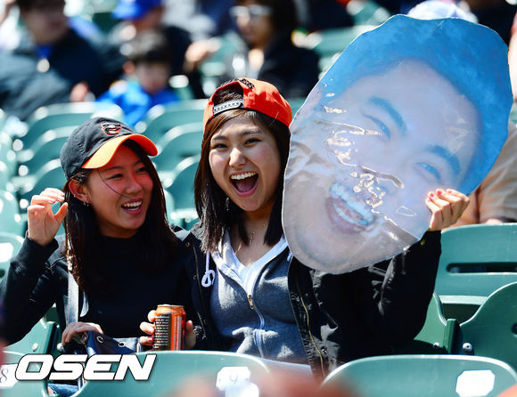 경기 전 류현진 한국인 팬들이 류현진 얼굴이 담긴 피켓을 들고 있다.