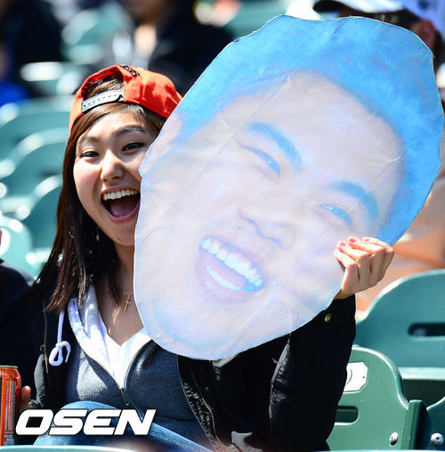 경기 전 류현진 한국인 팬들이 피켓을 들고 있다.