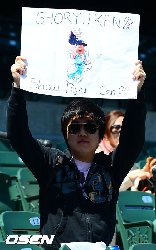 경기 전 류현진의 한국인 팬들이 피켓을 들고 있다.