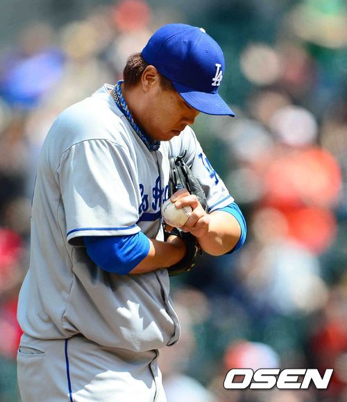 21일 새벽(이하 한국시간) 미국 메릴랜드주 볼티모어 캠던 야즈 오리올 파크에서 벌어진 ‘2013 메이저리그’ 볼티모어 오리올스와 LA 다저스의 경기 2회말 무사 1루 류현진이 하디에게 투런 홈런을 맞고 아쉬워 하고 있다.