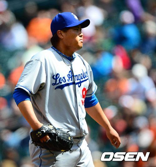 21일 새벽(이하 한국시간) 미국 메릴랜드주 볼티모어 캠던 야즈 오리올 파크에서 벌어진 ‘2013 메이저리그’ 볼티모어 오리올스와 LA 다저스의 경기 류현진이 2회에 이어 4회에 레이몰드에게 솔로 홈런을 허용한 후 아쉬워 하고 있다.