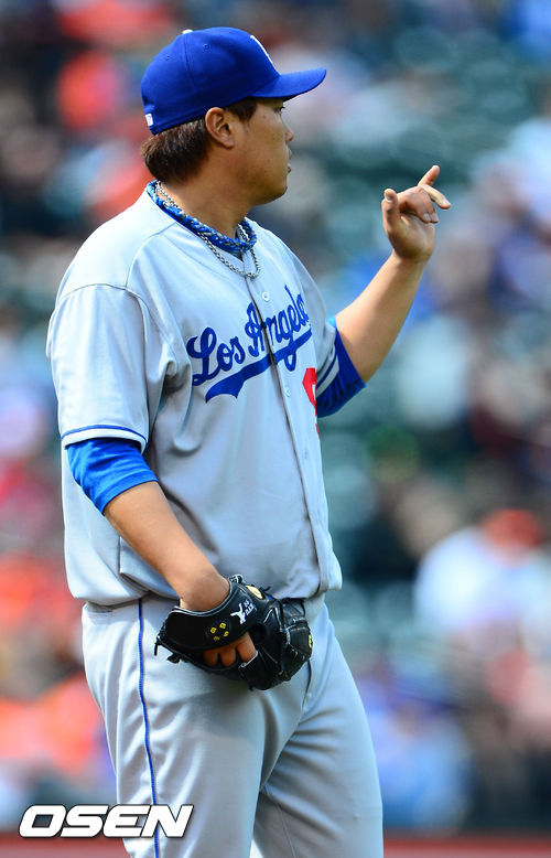 21일 새벽(이하 한국시간) 미국 메릴랜드주 볼티모어 캠던 야즈 오리올 파크에서 벌어진 ‘2013 메이저리그’ 볼티모어 오리올스와 LA 다저스의 경기 류현진이 6회에 사인을 보내고 있다.