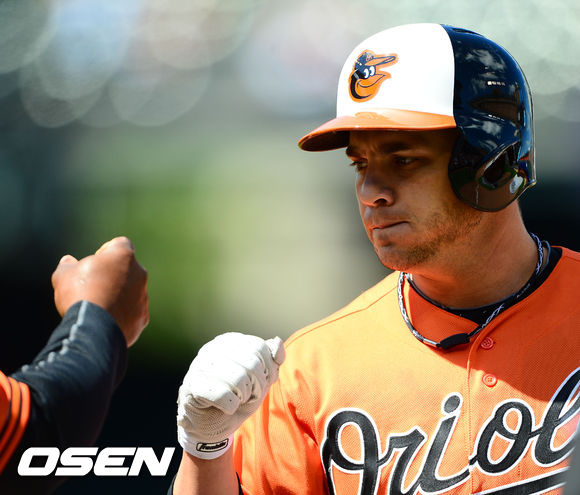 21일 새벽(이하 한국시간) 미국 메릴랜드주 볼티모어 캠던 야즈 오리올 파크에서 벌어진 ‘2013 메이저리그’ 볼티모어 오리올스와 LA 다저스의 경기 6회 1사 주자 2루 좌전 1타점 역전 적시타를 날리느 올리올스 스티브 피어스가 1루에서 기뻐하고 있다.