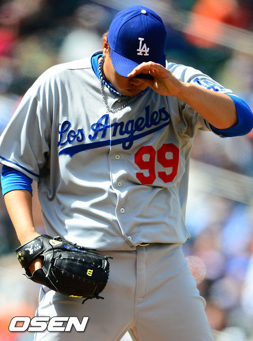 21일 새벽(이하 한국시간) 미국 메릴랜드주 볼티모어 캠던 야즈 오리올 파크에서 벌어진 ‘2013 메이저리그’ 볼티모어 오리올스와 LA 다저스의 경기 6회 1사 주자 2루 올리올스 스티브 피어스가 좌전 1타점 역전 적시타를 날리자 다저스 선발 류현진이 아쉬운 표정을 짓고 있다.