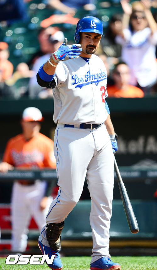 21일 새벽(이하 한국시간) 미국 메릴랜드주 볼티모어 캠던 야즈 오리올 파크에서 벌어진 ‘2013 메이저리그’ 볼티모어 오리올스와 LA 다저스의 경기 7회초 1사 1,3루에서 곤살레스가 폭투 상황때 3루주자 마크 엘리스를 불러들이고 있다.