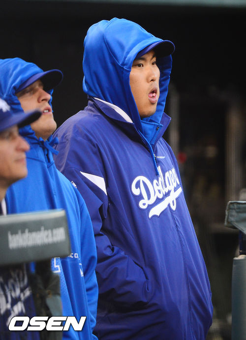 LA 다저스 류현진이 볼티모어 오리올스 선발 천웨인의 피칭을 바라보고 있다.