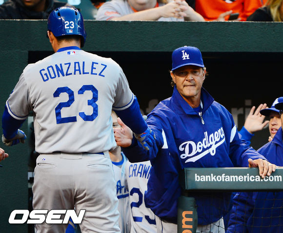 1회초 1사 주자 1,3루 LA 다저스 곤살레스가 좌익수 희생플라이로 1타점을 올린 후 돈 메팅리 감독과 하이파이브를 하고 있다.
