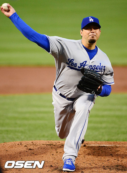 LA 다저스 선발 조쉬 베켓이 힘차게 공을 뿌리고 있다.