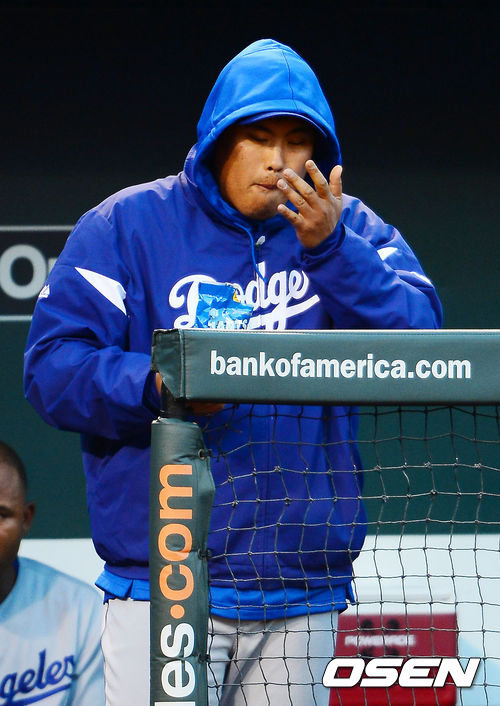 LA 다저스 류현진이 덕아웃에서 경기를 지켜보며 해바라기씨를 먹고 있다.