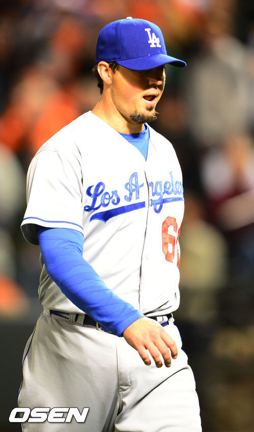 6회말 2사 주자 1,2루 볼티모어 마차도에게 좌월 스리런 홈런을 맞은 LA 다저스 선발 베켓이 교체되고 있다.