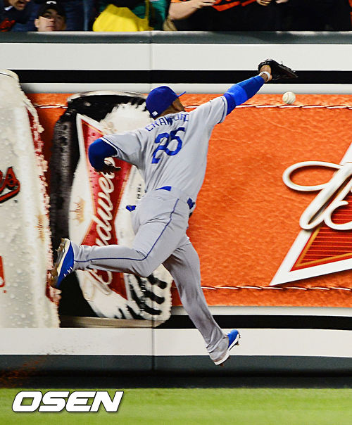 5회 2사 주자 3루 아담존스의 좌전 2루타 때 LA 다저스 좌익수 크로포드가 볼을 잡지 못하고 있다.