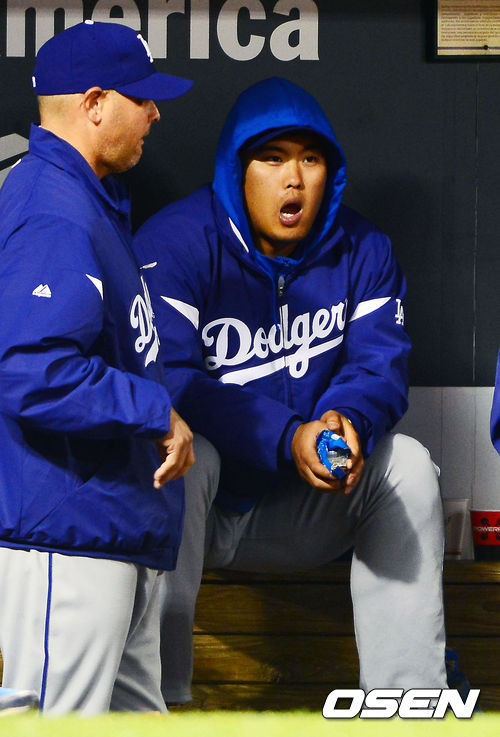 류현진이 LA 다저스 덕아웃에서 한숨을 내쉬고 있다.