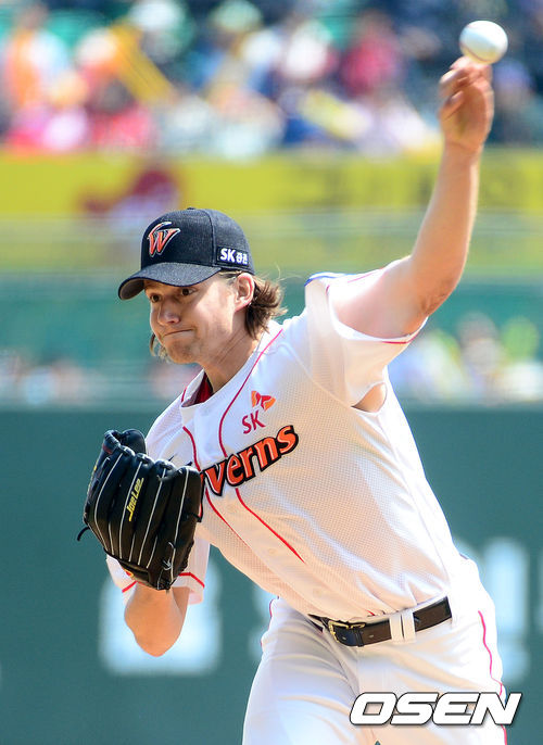 21일 오후 인천 문학야구장에서 열린 2013 한국야쿠르트 세븐프로야구 SK 와이번스와 KIA 타이거즈의 경기, 1회초 무사에서 SK 선발 투수 세든이 힘차게 공을 던지고 있다.