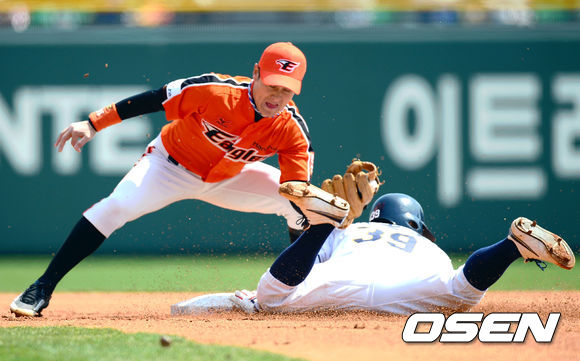 21일 오후 서울 잠실야구장에서 열린 '2013 한국야쿠르트 세븐 프로야구' 두산 베어스와 한화 이글스의 경기, 1회말 무사 1루 두산 이종욱이 2루 도루를 성공하고 있다.