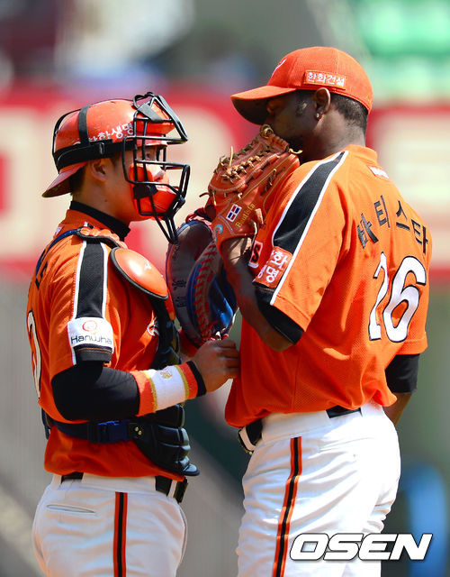 21일 오후 서울 잠실야구장에서 열린 '2013 한국야쿠르트 세븐 프로야구' 두산 베어스와 한화 이글스의 경기, 1회말 1사 만루 한화 바티스타와 정범모가 이야기를 나누고 있다.