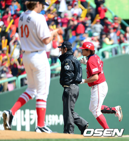 21일 오후 인천 문학야구장에서 열린 2013 한국야쿠르트 세븐프로야구 SK 와이번스와 KIA 타이거즈의 경기, 5회초 무사에서 KIA 최희섭이 중월 솔로 홈런을 치고 그라운드를 돌고 있다.