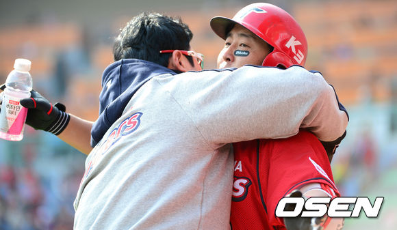 21일 오후 인천 문학야구장에서 열린 2013 한국야쿠르트 세븐프로야구 SK 와이번스와 KIA 타이거즈의 경기, 7회초 무사에서 KIA 박기남이 좌월 솔로 홈런을 치고 덕아웃에서 서재응과 하이파이브를 하고 있다.