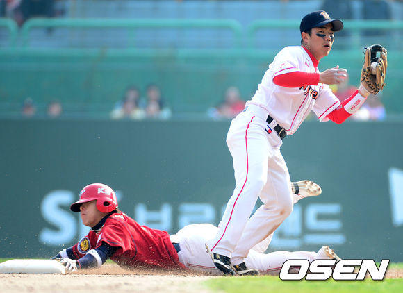 21일 오후 인천 문학야구장에서 열린 2013 한국야쿠르트 세븐프로야구 SK 와이번스와 KIA 타이거즈의 경기, 7회초 2사 1,3루에서 KIA 안치홍 타석 때 1루주자 김선빈이 2루 도루에 성공하고 있다.