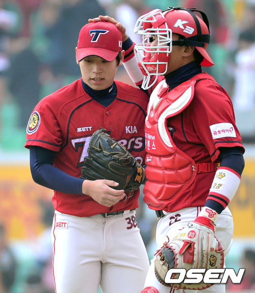 경기 종료 후 KIA 박준표와 김상훈이 승리의 기쁨을 나누고 있다. /sunday@osen.co.kr