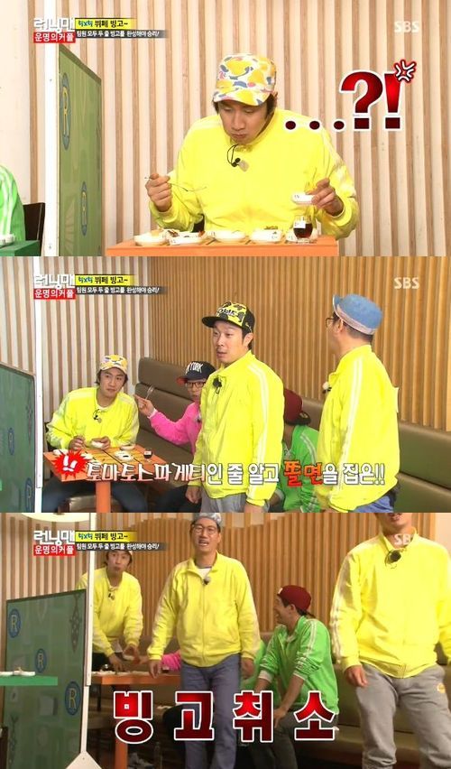 우여곡절 끝에 드디어 스파게티 하나만 먹으면 빙고가 완성되는 상황. 광수는 자신 있게 "토마토 스파게티"를 외쳤고 음식을 들고 먹기 시작했다. 광수의 빙고가 완성된 줄 안 지석진과 하하는 기쁨을 감추지 못했다. 그러나 광수의 표정이 일그러지기 시작했다. 알고 보니 광수가 집어 먹은 것은 토마토 스파게티가 아닌 쫄면. 쫄면을 스파게티로 착각하고 먹는 바람에 광수의 빙고는 취소되고 말았다. 당황한 광수에게 멤버들의 원성이 쏟아졌다. 쫄면과 스파게티를 구분 못한 광수가 원망스러운 지석진과 하하는 맹비난을 퍼부었다.