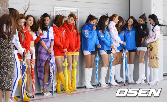 21일 오후 전남 영암 코리아인터내셔널서킷에서 진행된 2013 코리아 스피드 페스티벌(이하 KSF)에서 레이싱모델들이 매서운 바람을 맞으며 대회 개막을 기다리고 있다