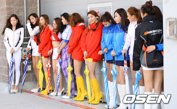 21일 오후 전남 영암 코리아인터내셔널서킷에서 진행된 2013 코리아 스피드 페스티벌(이하 KSF)에서 레이싱모델들이 매서운 바람을 맞으며 대회 개막을 기다리고 있다